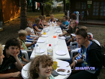 Heute Morgen fuhren die Großen mit dem Ruderboot zum Einkaufen. Danach rächten sich die Jungs noch einmal, in dem sie die Mädchen nach dem Einkaufen mit Schlagsahne vollsprühten und mit Mehl bewarfen.