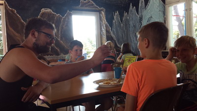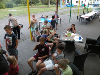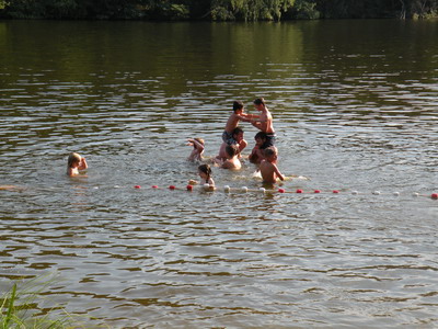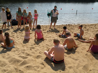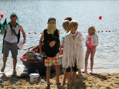 Heute durften alle etwas länger schlafen, da wir letzte Nacht eine spontane Nachtwanderung unternahmen. Dabei erklärte Rick uns, wie man sich nachts im Dunkeln und im Wald orientiert. Nach einem leckeren Frühstück ging es wieder zurück in unsere kleinen Projektgruppen (Cindys Traumfänger-Bastel-Gruppe und Bobs Trommelgruppe). Nach einer deftigen Bratwurst mit Kartoffelbrei gingen die Kinder in die Mittagsruhe, in welcher die Betreuer das Neptunfest vorbereiteten. Neptun alias Bob suchte sich ein paar Häscher und Nixen und taufte einen nach dem anderen, um ihn in sein Meeresreich aufzunehmen. Danach badeten wir noch, bis wir im Anschluss dann auf unserer Terrasse leckere Hamburger und Bratwürste grillten und hinterher ein paar Marshmallows rösteten über der verbleibenden Glut des Grills. Vorm Schlafen packten wir dann alle schon unsere Koffer und richteten die Zimmer so gut wie möglich her.