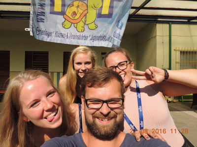 Mareike, Samira, Natalie und der Lagerleiter Rick wünschen allen Kindern