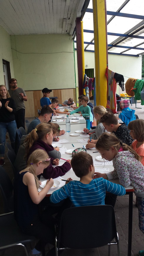 Nach unserer üblichen Gesangsrunde am morgen starteten wir mit dem Frühstück und gleich danach ging es künstlerisch kreativ weiter. Teller wurden bemalt mit Keramikstiften. Es wurden schöne Motive gezeichnet, Widmungen und Unterschriften von neuen Freunden und Lieblingsbetreuern gesammelt. (Die Anleitung für die Nachbereitung der Teller folgt am Ende des Textes.)