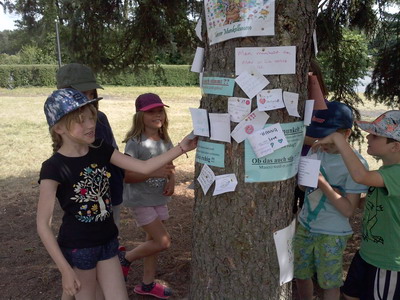 Luca: Dann hatte Fritz die tolle Idee den Munkelbaum einzuführen. Der Munkelbaum ist ein Baum, wo man die neusten Nachrichten verbreiten kann, indem man eine Nachricht auf einen Zettel schreibt und diesen an den Baum hängt.
