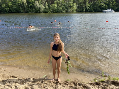 „Heute waren wir auf einem Ponyhof. Der Weg war echt lang. Dann waren wir reiten, als erstes habe ich das Pferd geführt und Nina saß auf dem Pferd und dann ich. ich durfte auch 2 Tricks machen und der coolste war das ich alleine auf dem Pferd stand. Als wir gewartet haben dass wir endlich gehen können habe ich ein Pony geführt, sogar im Galopp. außerdem hatte der Pferdehof 2 Hunde die waren echt  süß! Als wir zurück gekommen sind war uns echt heiß und deswegen sind wir baden gegangen. Da habe ich eine Rote Beete im Wasser gefunden. Das war lustig. Der tag war schön, aber seht selbst  “