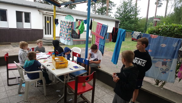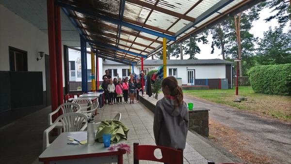 Heute hatten wir den gesamten Tag über mit sehr merkwürdigem Wetter zu tun. Mal war es warm und wir hätten vielleicht baden gehen können. Und 3 Minuten später hat es dann geregnet. Dadurch verbrachten wir den Vormittag unsere Zeit sehr lange auf der Terasse. Hier wurde gemalt oder auch Spiele gespielt. Die Gruppe 3 ging mit ihrem Betreuer Flo und der lieben Sokessa in den Wald, um Häuschen zu bauen. Leider wurden sie von einem Regenschauer überrascht und mussten schnell wieder zurückkommen. Mareike hat mit ihrer Gruppe „The Mole“ gespielt, wobei die Gruppe einen „Maulwurf“ finden musste, der die Spiele sabotierte. Bob ließ sich von seinen Damen mit neuen Spielen inspirieren.
