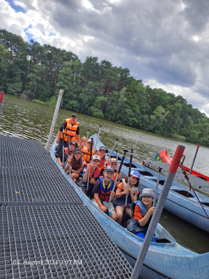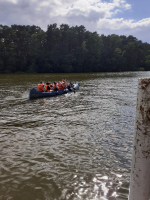 Nach dem Mittagessen fahren alle eine kleine Runde Kanu und gleiten über das Wasser.